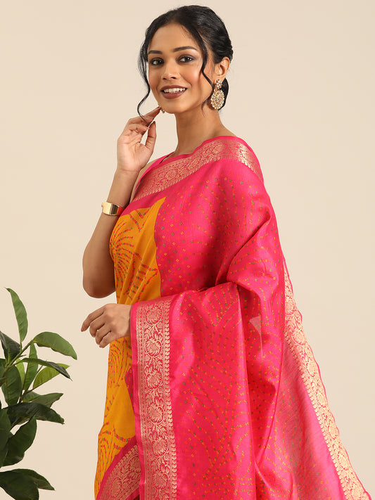 Vanya–Yellow Pink Printed Weaving Silk Saree