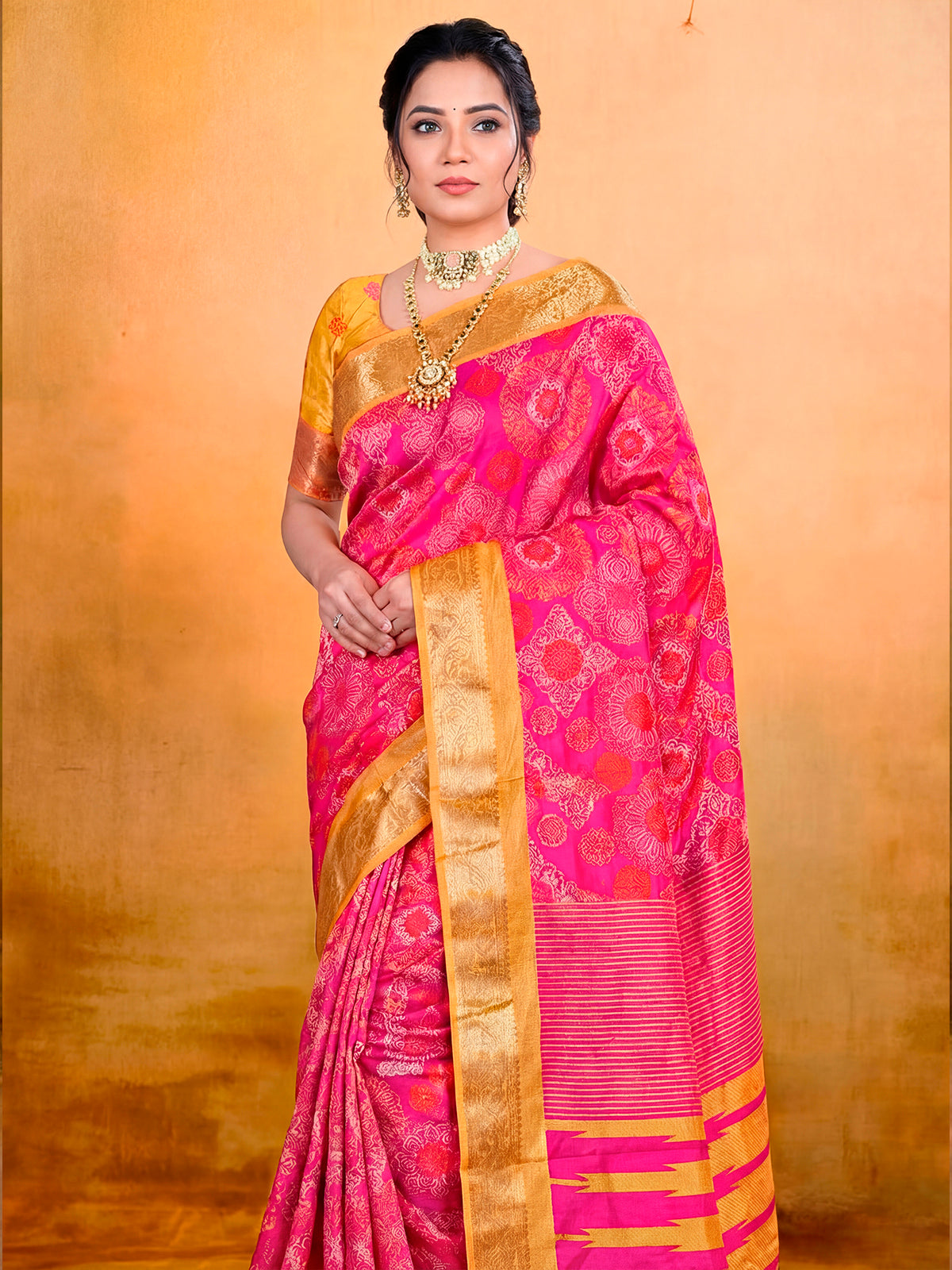 Made from fine Soft Silk, this rose pink saree from the Kashmir Beauty collection showcases a soft printed design with a graceful finish. A matching blouse piece in the same fabric is included. Comfortable and elegant, it’s well suited for daily wear.