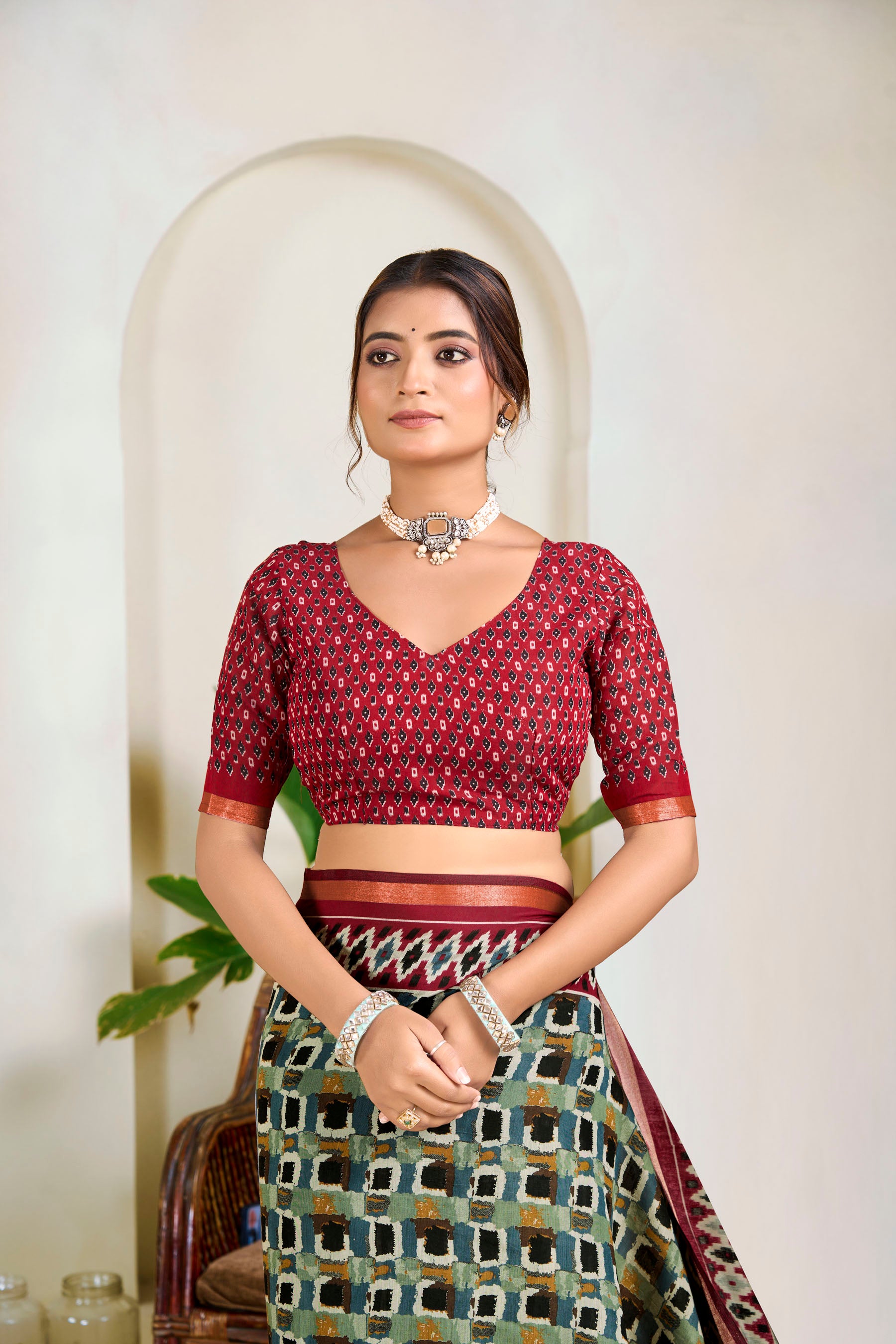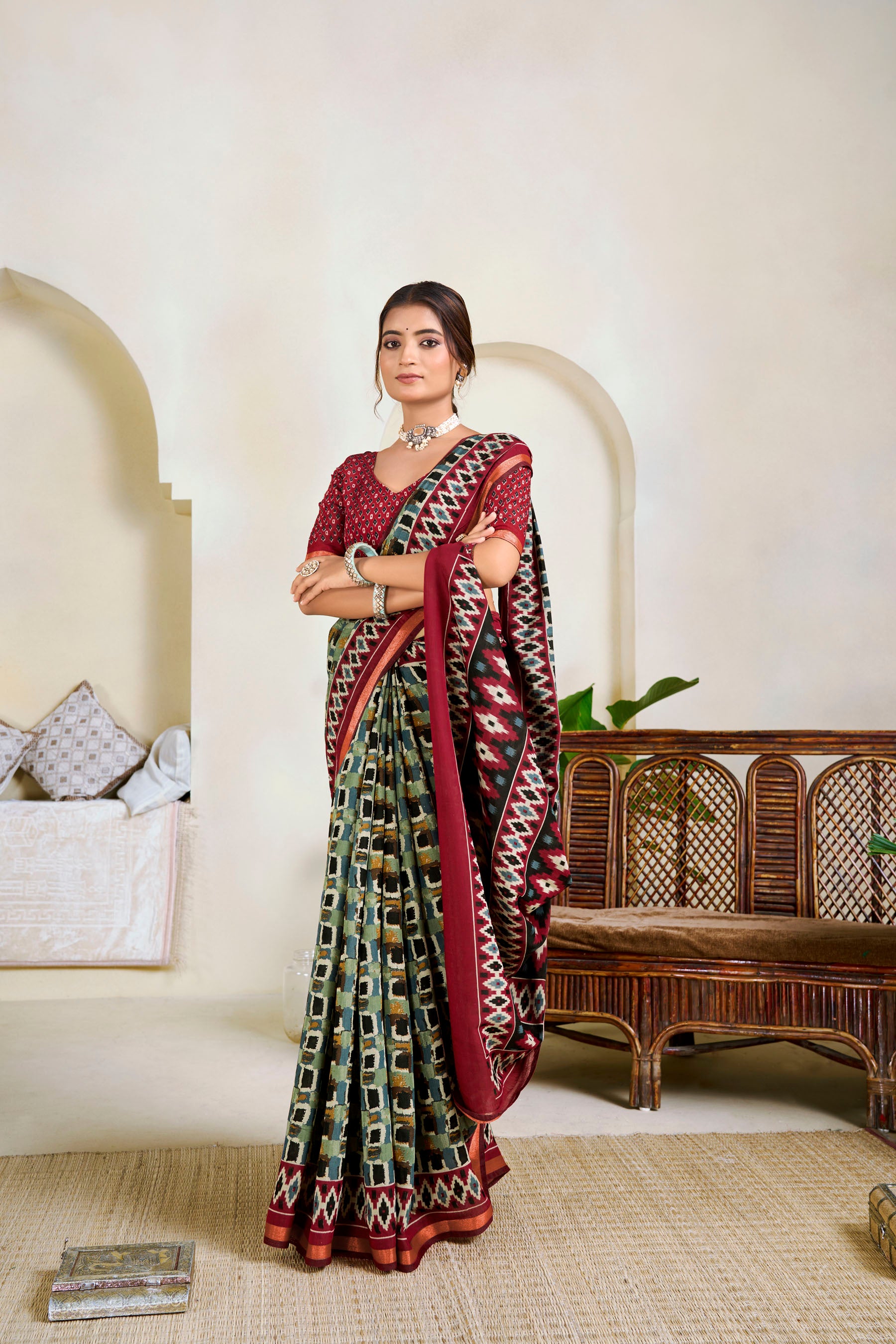This green saree, part of the Monalisa collection, is designed using premium Liva Cotton Silk featuring a tasteful printed motif. Comes with a coordinating blouse piece made of the same fabric. Designed for ease and versatility, it fits beautifully into any celebration.