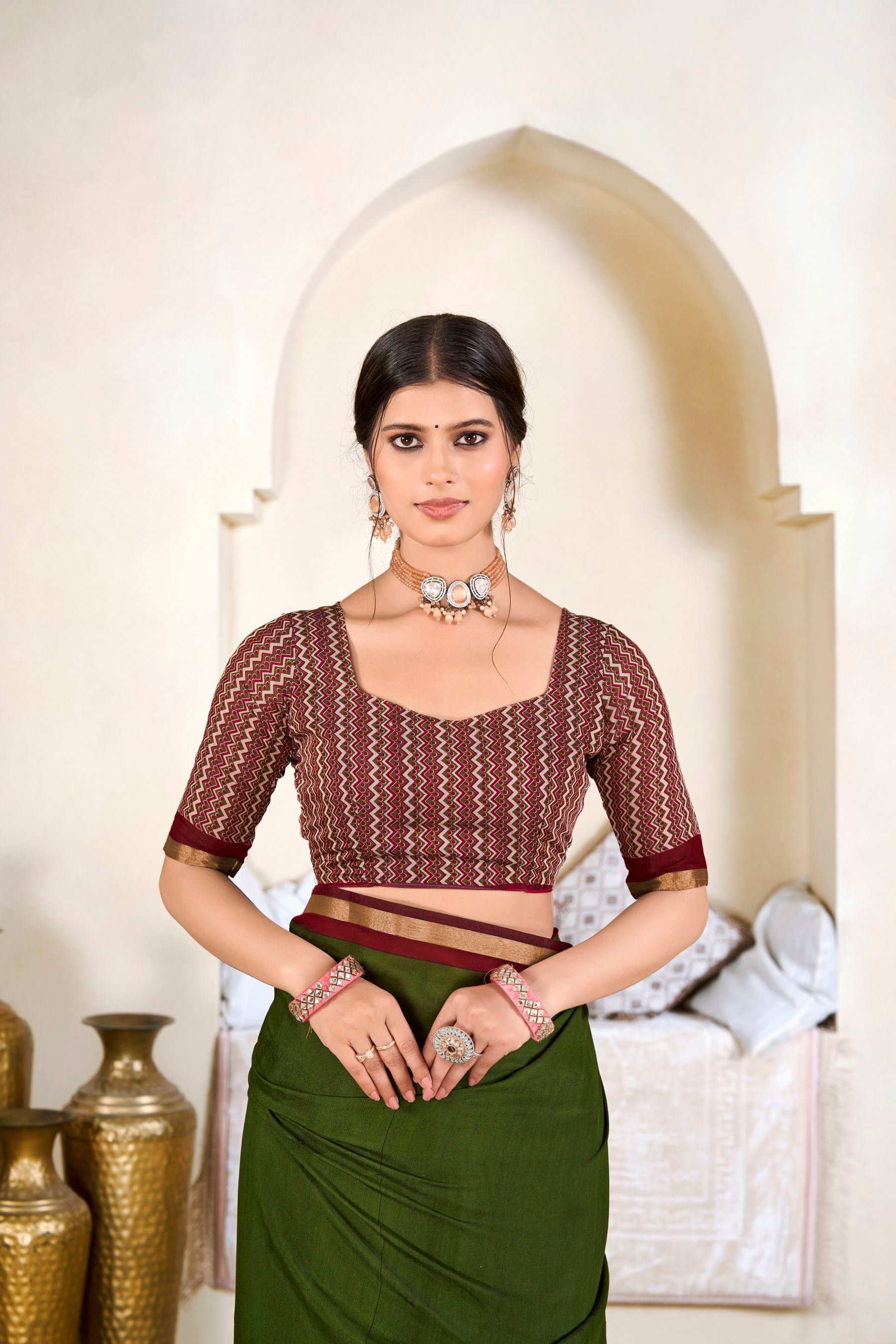 Crafted from soft Liva Cotton Silk, this green saree belongs to the Monalisa collection that showcases a beautiful printed style. It includes a matching blouse piece made from the same fabric. Comfortable to wear, it suits celebrations and casual occasions alike.