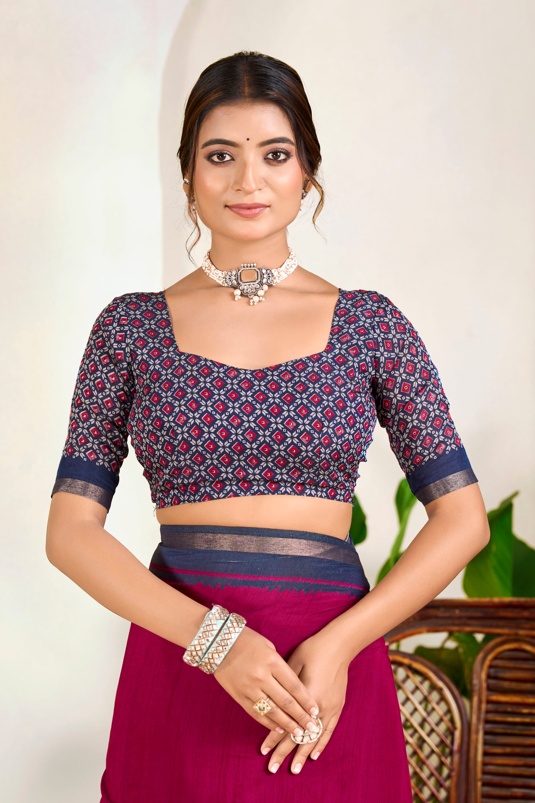 This pink saree, part of the Monalisa collection, is designed using premium Liva Cotton Silk and displays an attractive printed look. It includes a matching blouse piece made from the same fabric. Lightweight and easy to drape, this saree is ideal for festive and social gatherings.