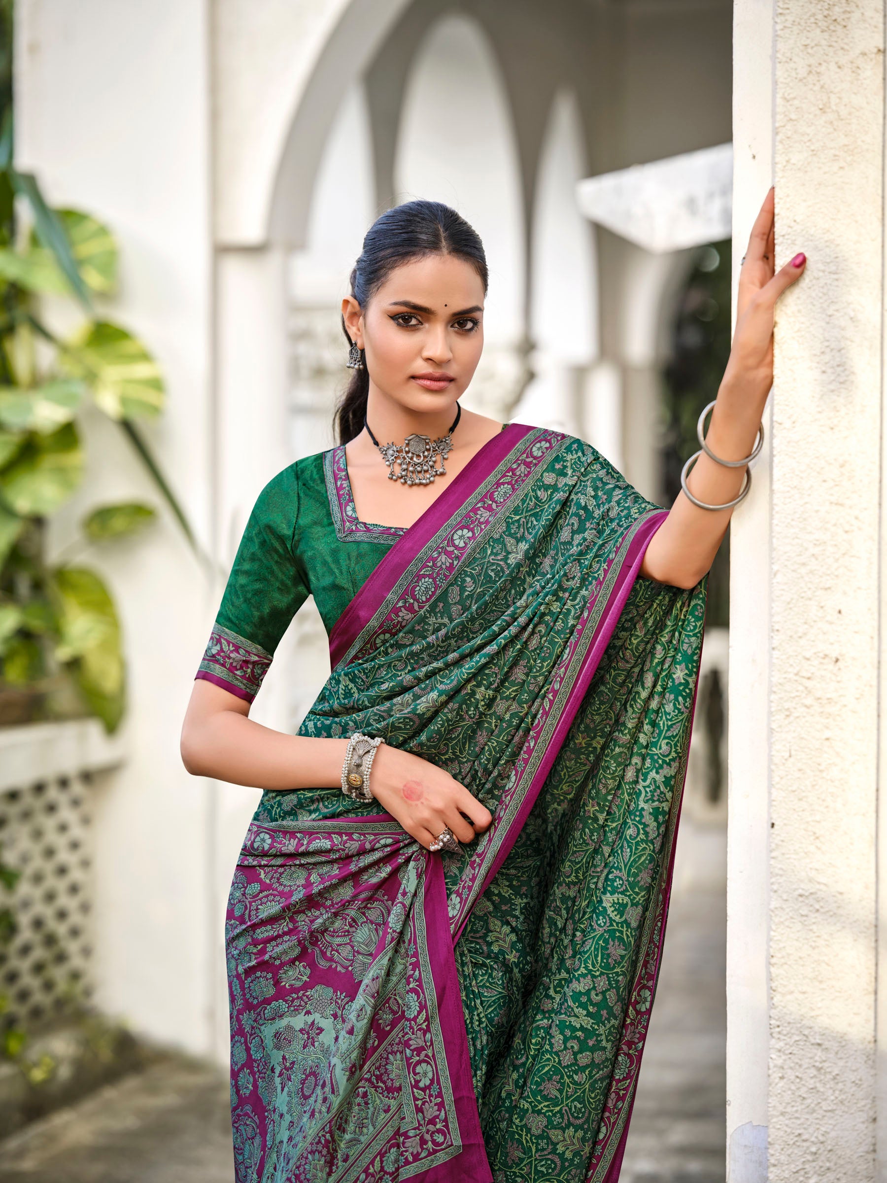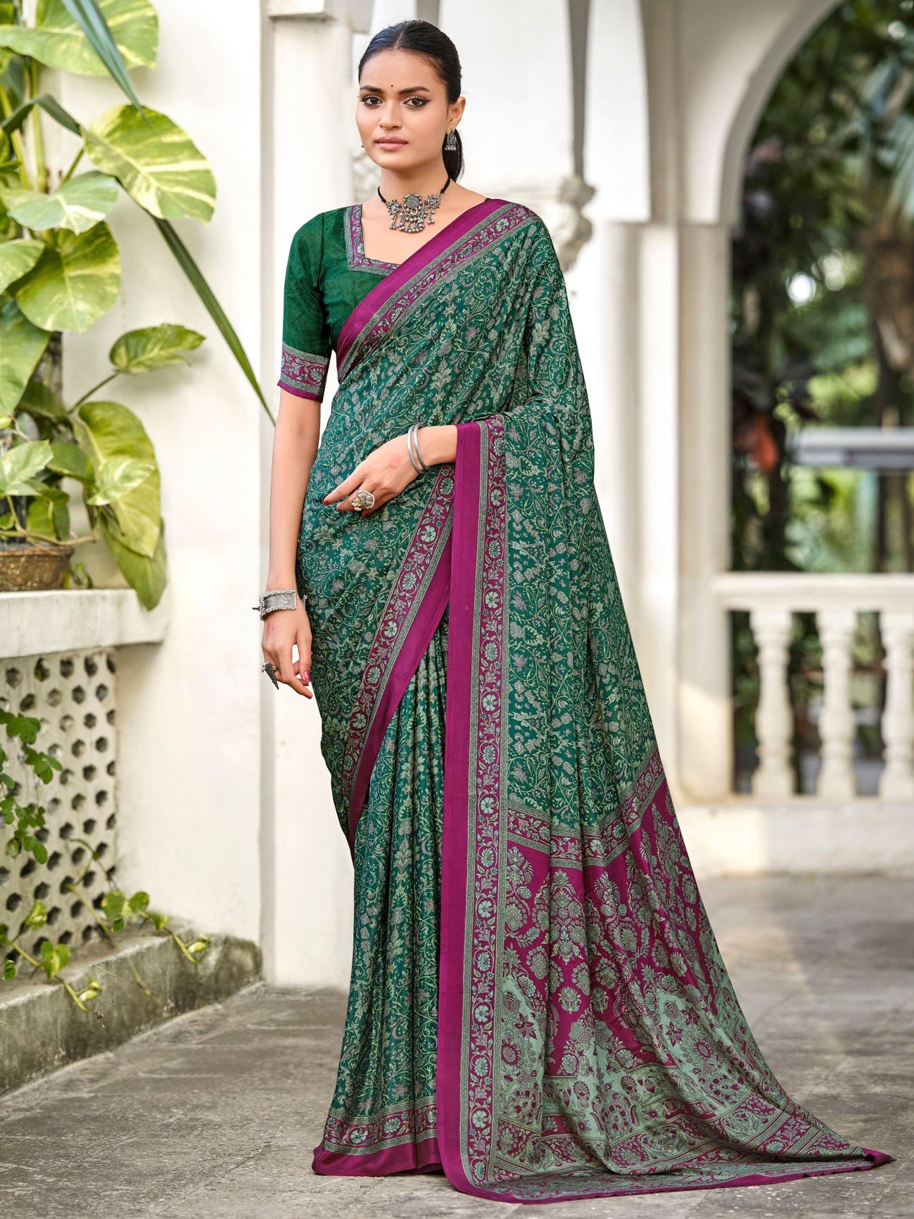 This green saree, part of the Rajkala collection, is designed using premium Crepe Silk that showcases a beautiful printed style. Comes with a coordinating blouse piece made of the same fabric. Perfect for both festive and day events, it offers style with comfort.