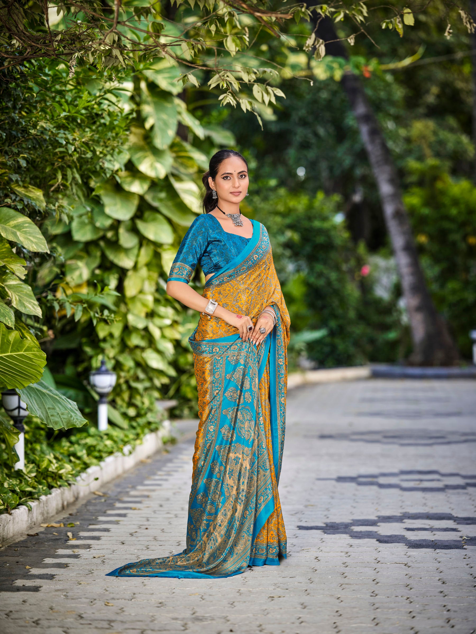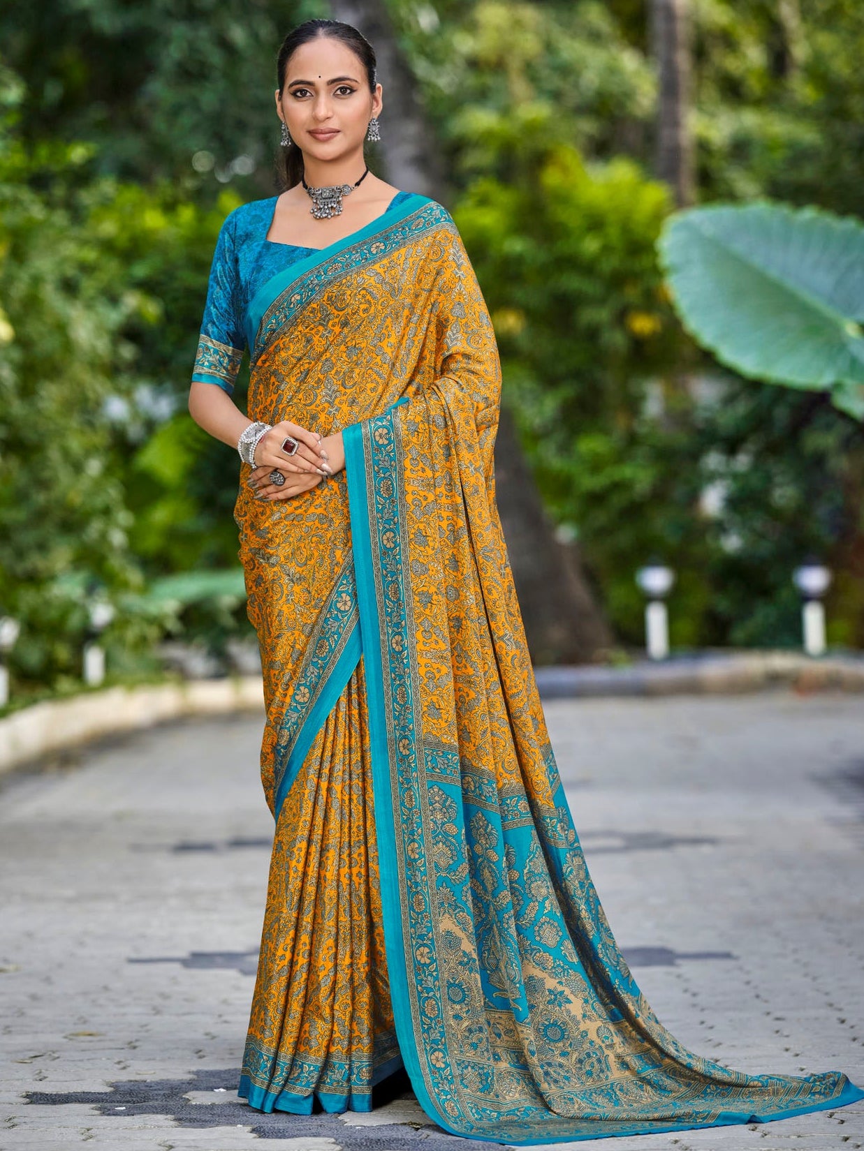This yellow saree, part of the Rajkala collection, is designed using premium Crepe Silk highlighting a charming printed pattern. Includes a blouse piece crafted in the same soft fabric. Soft and airy, it’s a great choice for cultural events and social get-togethers.